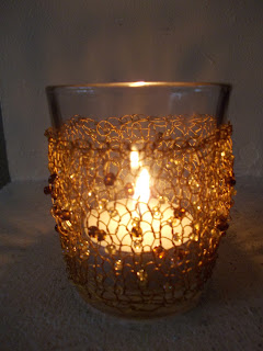 Another candle holder knitted in metallic wire.